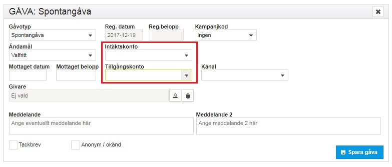 När man manuellt registrerar en GÅVA så anges Intäktskonto och Tillgångskonto för att veta vilka konton gåvan ska stämmas av mot.