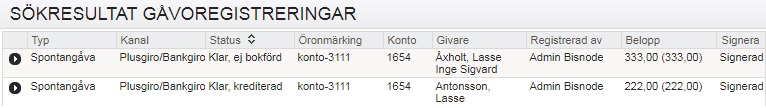Sökning tar automatiskt fram alla gåvor som har ogiltiga konton. Gåvorna visas i träfflistan. För att ändra konto fäller man ut gåvan på pilen och väljer att redigera gåvan. Om inget behov finns att hantera gåvan kan man via kugghjulet välja att ”ta bort” gåvan. Gåva tas då inte bort som gåva men försvinner ur listan för de som ska hanteras.