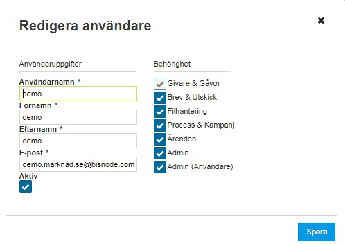 Rättigheterna styrs för varje meny i Charity. Admin (Användare) krävs för att få hantera användare.
